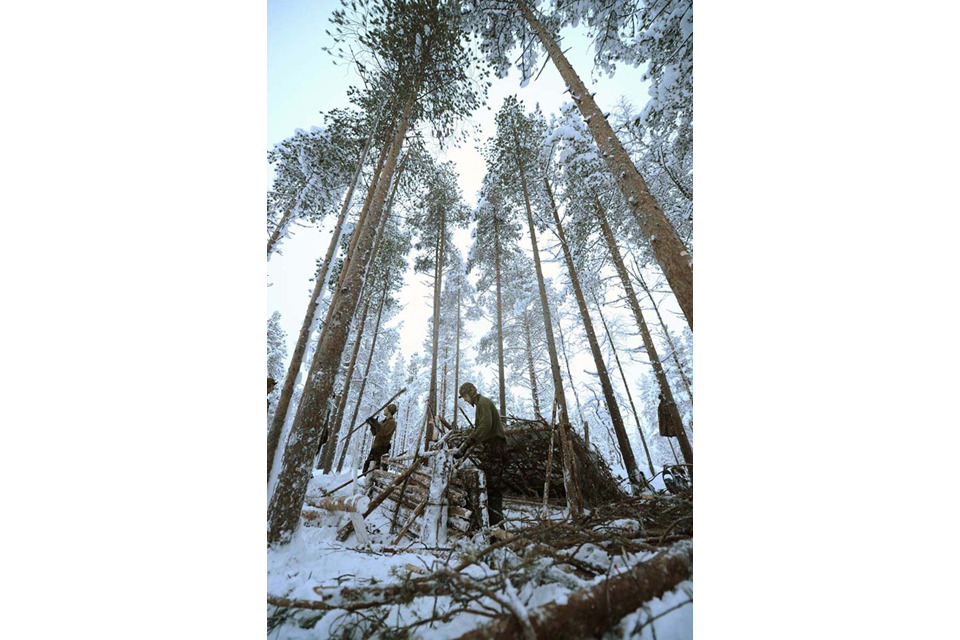 Two aircraft technicians constructing a lean-to survival shelter [Picture: Crown Copyright/MOD 2013]