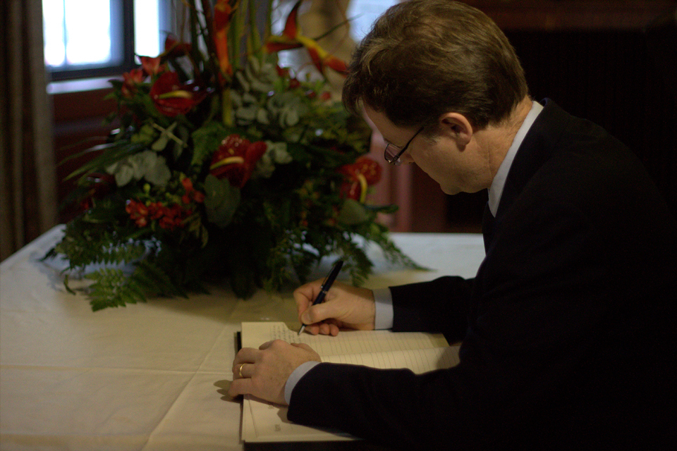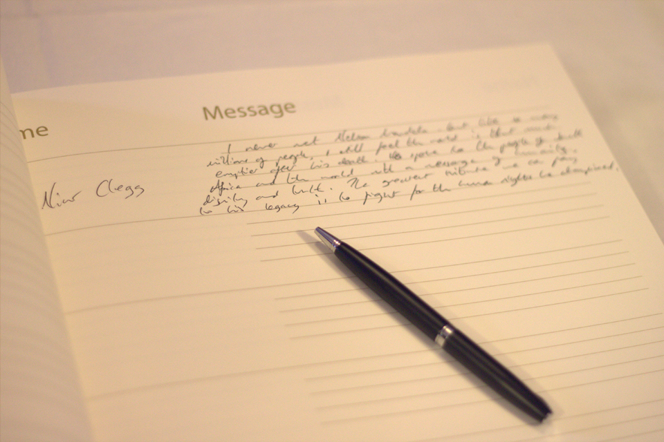 Nick Clegg signing a book of condolence for Nelson Mandela at South Africa House.