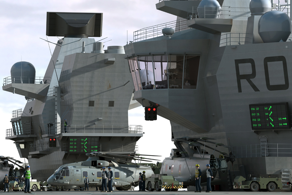 Computer-generated image of HMS Queen Elizabeth's superstructure on the starboard side of the flight deck [Picture: Copyright BAE Systems]