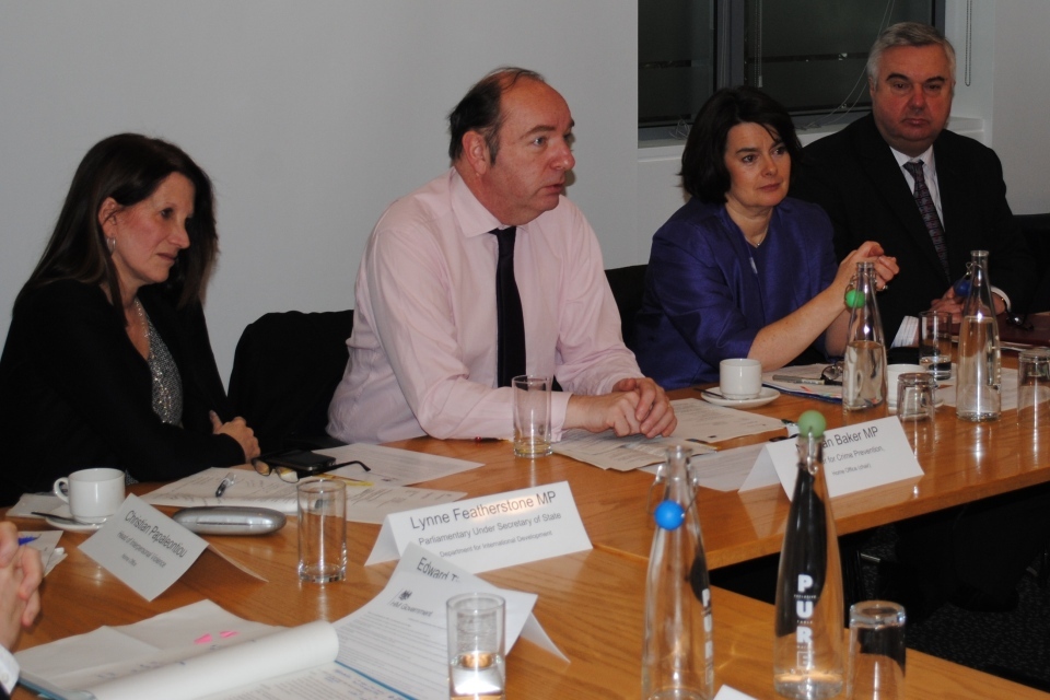Government ministers Lynne Featherstone (DfID), Norman Baker (Home Office), Jane Ellison (Department of Health) and Oliver Heald (solicitor general) listen to views at the FGM roundtable.