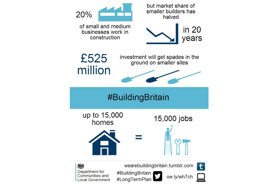 This government has got Britain building again, and created thousands of jobs in the construction sector. But it has been harder for smaller schemes to come back from the crash of 2008 and, as part of our long-term economic plan, we want them to have a bigger role in building homes for the housing market.