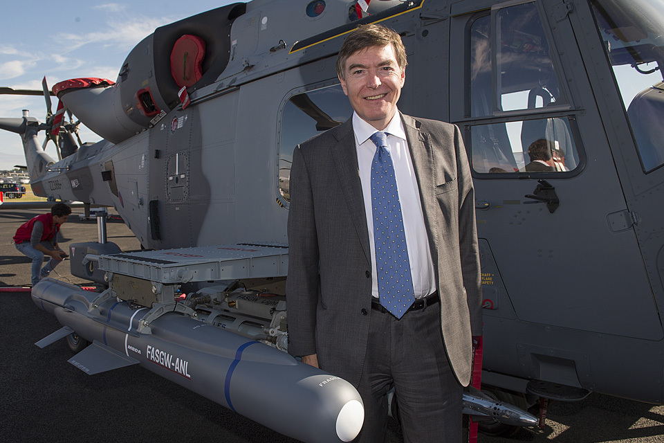 Minister for Defence Equipment, Support and Technology Philip Dunne with one of the new missiles attached to a Wildcat helicopter at the Farnborough International Air Show [Picture: David Tucker]