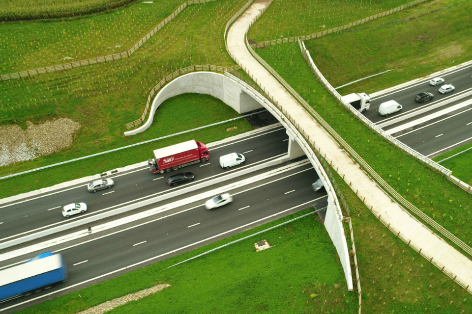 The green bridge over the A556 in Cheshire is seamlessly integrated with the context and allows for wildlife to cross
