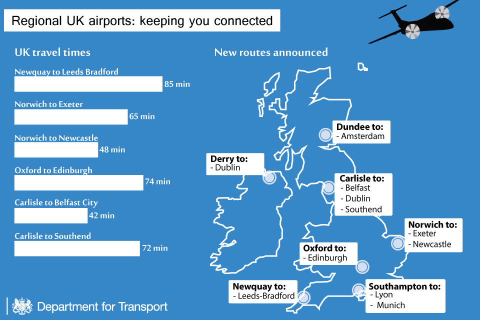 Start-up aid of up to £7 million is being provided through the Regional Air Connectivity Fund. The fund already supports strategic routes to London from Newquay and Dundee.