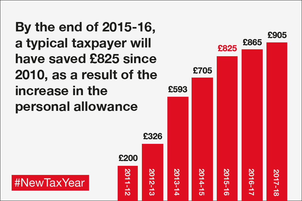 By the end of 2015-16, a typical taxpayer will have saved £825 since 2010, as a result of the increase in the personal allowance.