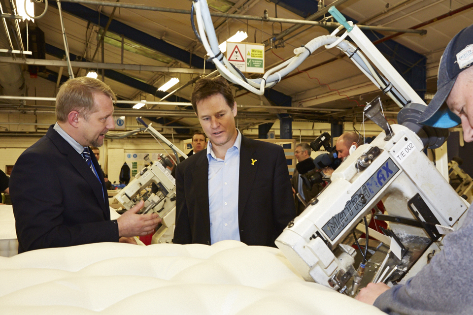 Nick Clegg at bed manufacturing company Harrison Spinks