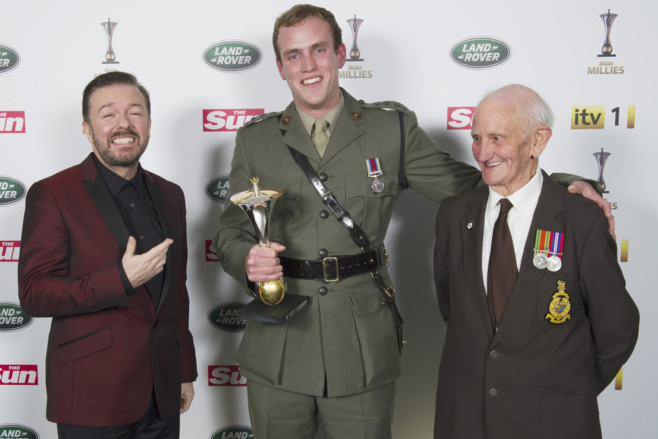 Captain Simon Maxwell received his Overcoming Adversity Award last year from his grandfather David Maxwell Senior and comedian Ricky Gervais [Picture: Arthur Edwards, Copyright The Sun]
