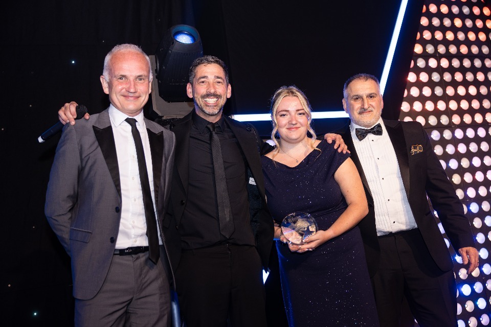 Chris Lloyd from Ureno, host Colin Murray and NRS mentor Sav Lagana present Keely Salter with her intermediate level apprentice of the year award