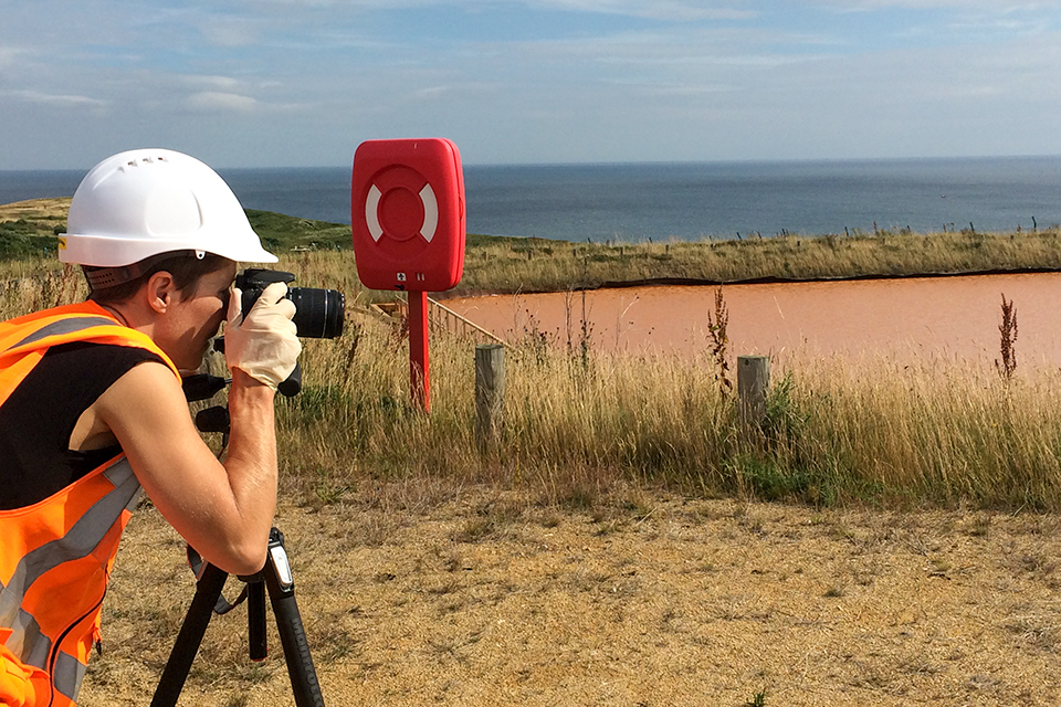 Onya McCausland taking a photograph of a Coal Authority mine water treatment scheme