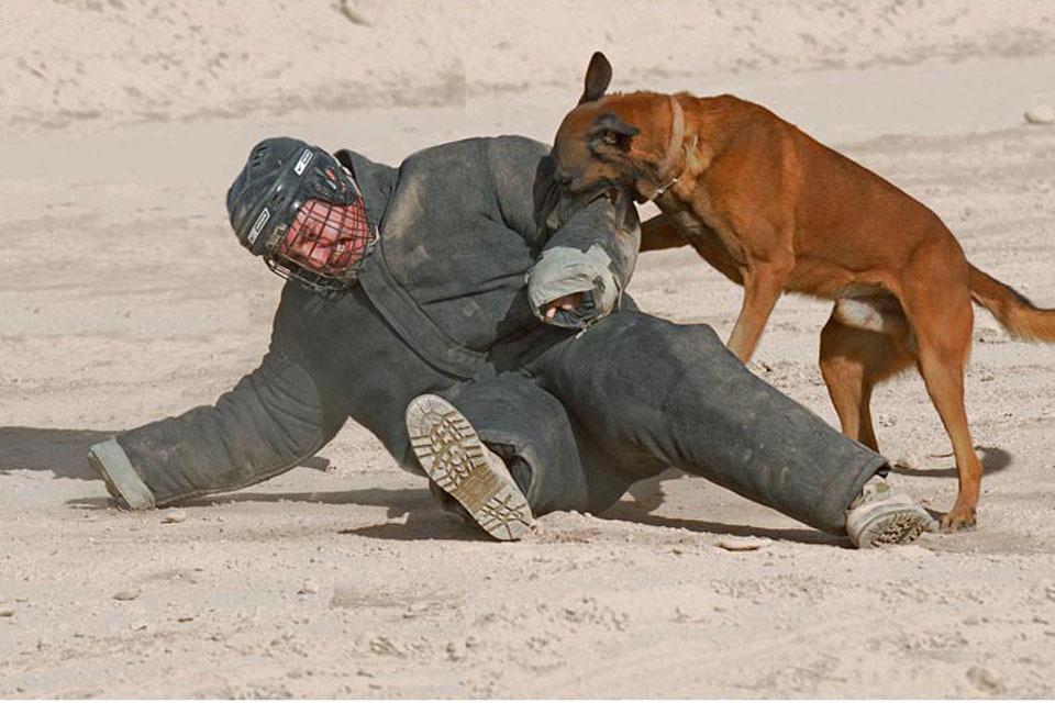 Spectators watch as Lieutenant Colonel Jez Hair is bitten by patrol dog Rex as part of the 'Bite the Boss' fundraising event for Macmillan Cancer Support [Picture: Sergeant Corrine Buxton RAF, Crown Copyright/MOD 2010]
