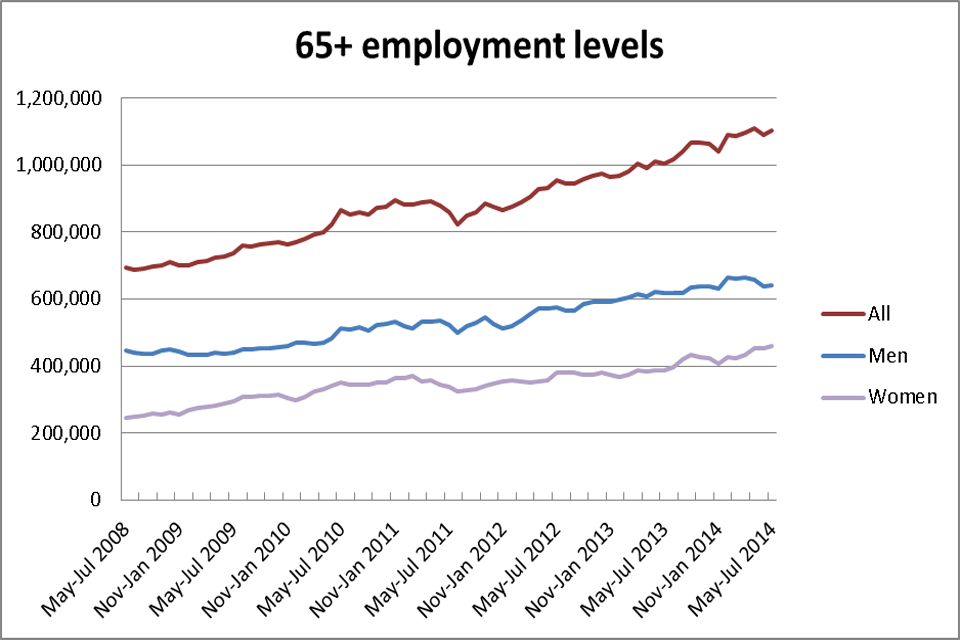 - there were 1.1 million people aged 65 plus in employment in May to July 2014, an increase of 229,000 since October to December 2011