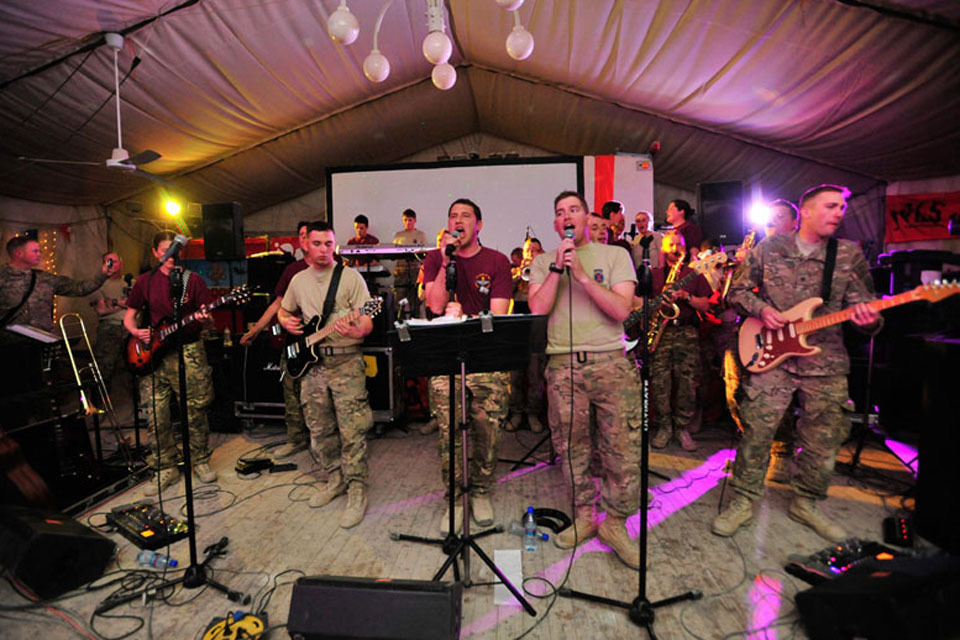 The Band of The Parachute Regiment performing as 'Ripcord' in a 'Battle of the Bands' at the 'Dutch Corner' (Dutch welfare facility) in Kandahar [Picture: Corporal Mark Webster RLC, Crown Copyright/MOD 2011]