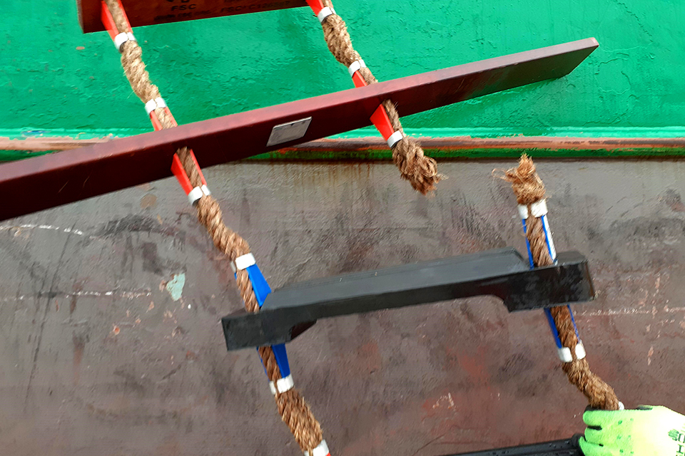 Close-up of broken rope on the right side of a pilot ladder. The ladder's identification plate is visible on the underside of the longest step