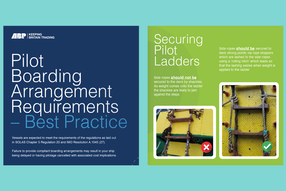 Introduction panel for from ABP's Pilot Boarding Arrangement Requirements - Best Practice poster next to a panel outlining do and don't guidance on securing pilot ladders