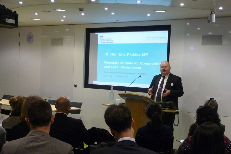 Eric Pickles speaking to organisations about the £6 million competition to fund community-based English language learning.