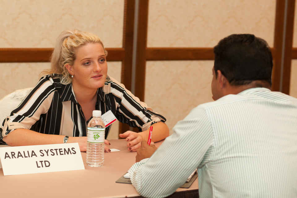 Eleanor Wright of Aralia Systems speaking to a potential investor in Cyberjaya, Malaysia