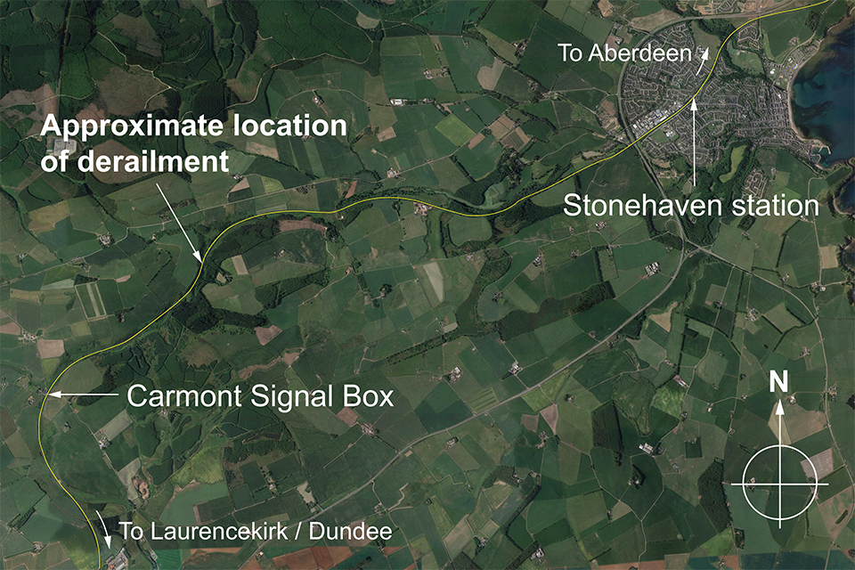 At around 09:40 hrs on Wednesday 12 August 2020, all six vehicles of a passenger train derailed after striking a landslip around 1.4 miles (2.25 km) north-east of Carmont, Aberdeenshire. There were nine people on the train at the time of the accident; three train crew (the driver, conductor and a second conductor travelling as a passenger on this train) and six passengers. Tragically, the driver of the train, the train’s conductor and one passenger suffered fatal injuries in the accident. The remaining passengers and member of train crew were taken to hospital.