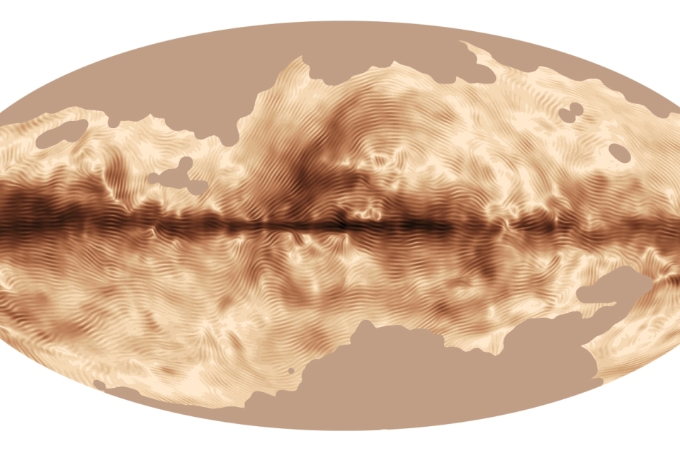The dark band running horizontally across the centre corresponds to the Galactic Plane. Here, the polarisation reveals a regular pattern on large angular scales, which is due to the magnetic field lines being predominantly parallel to the plane of the Milky Way.