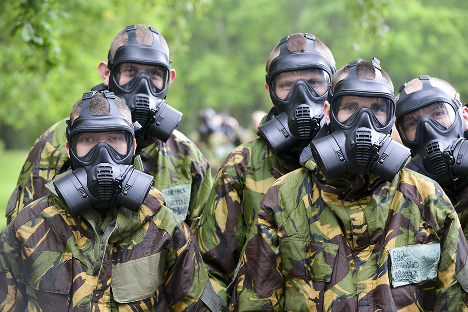 Army recruits wearing the new general service respirator during chemical, biological, radiological and nuclear training at Pirbright [Picture: Corporal Si Longworth RLC, Crown copyright]