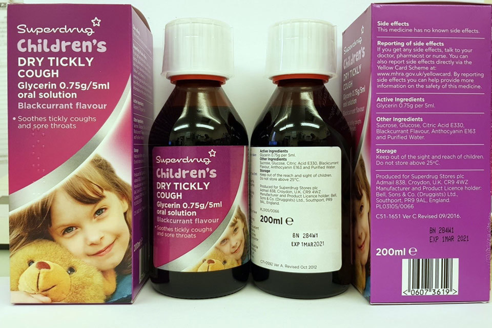 | Superdrug Children’s Dry Tickly Cough Glycerin 0.75 g/5 ml Oral Solution | 280V2, 284W1 | 01-Dec-2020, 01-Mar-2021 |