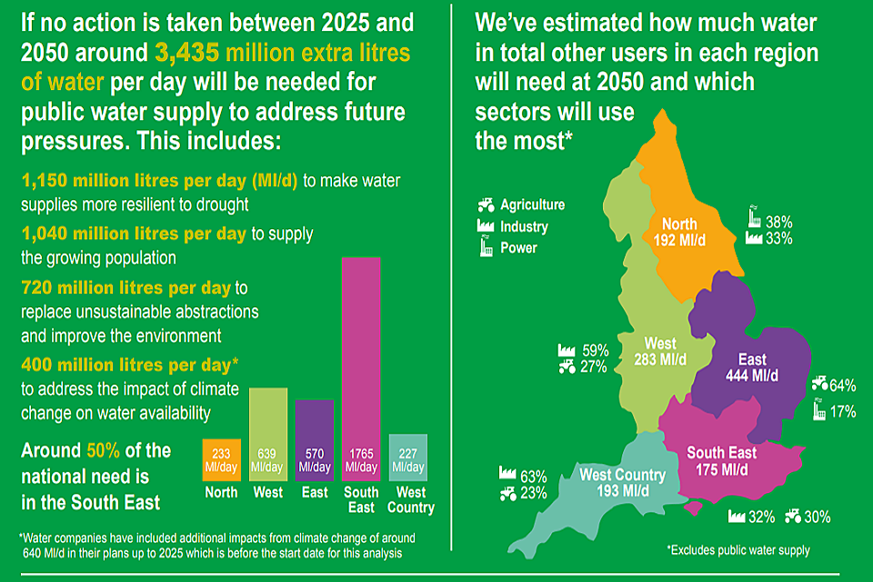 Five regional groups across the country will work up plans tailored to the specific needs of their individual area, bringing together the 17 English water companies, industry regulators, government and other water users. The framework will guide these groups and deliver a national blueprint for future water resources planning from 2025 to 2050 and beyond.