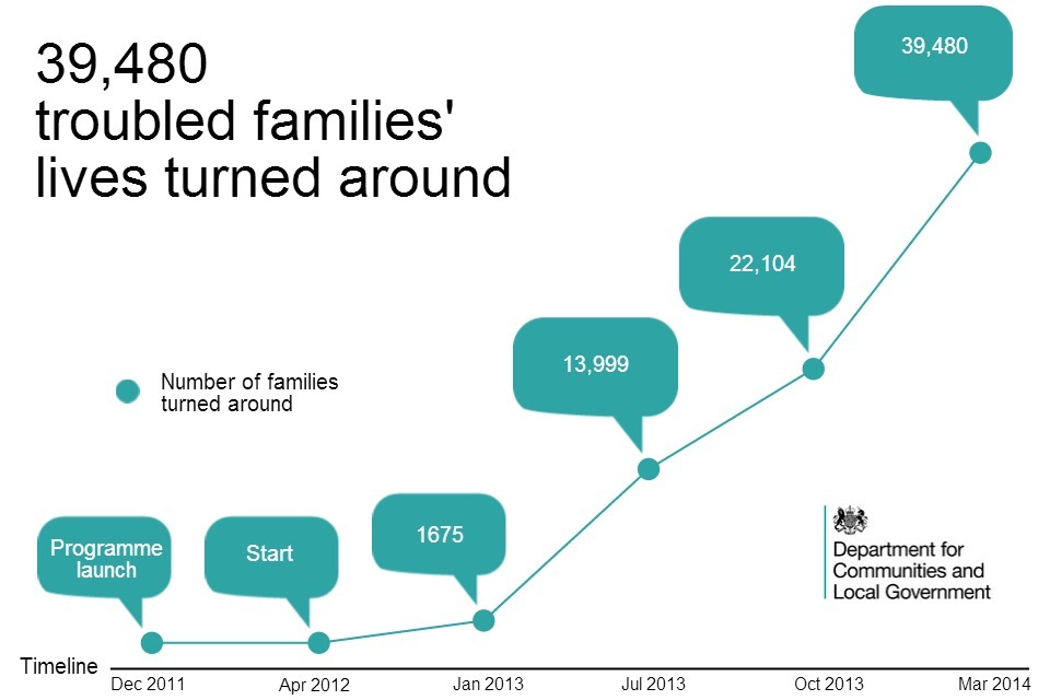 A progress update published by the Department for Communities and Local Government today showed that 39,480 families have now been turned around since the programme began, a number which has almost doubled in the past 6 months. This means that in nearly 40,000 troubled families: