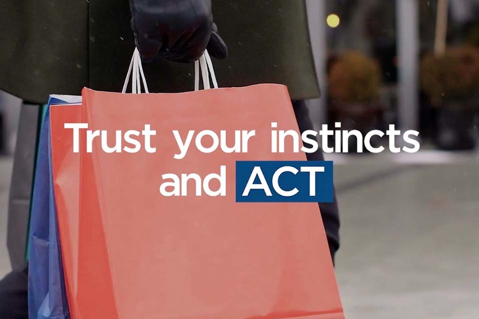Hand holding shopping bags with blurred background and the words “Trust your instincts and ACT” overlaid. [Crown Copyright.]