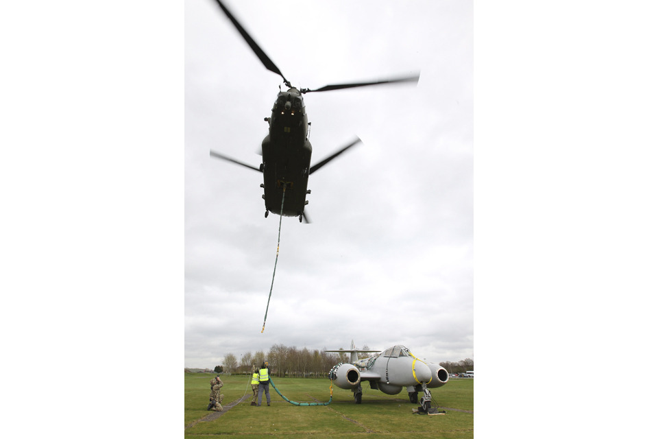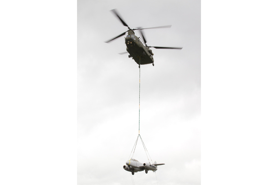 A Chinook helicopter airlifted one of the RAF's historic aircraft to a new jet museum yesterday, Monday 22 April.