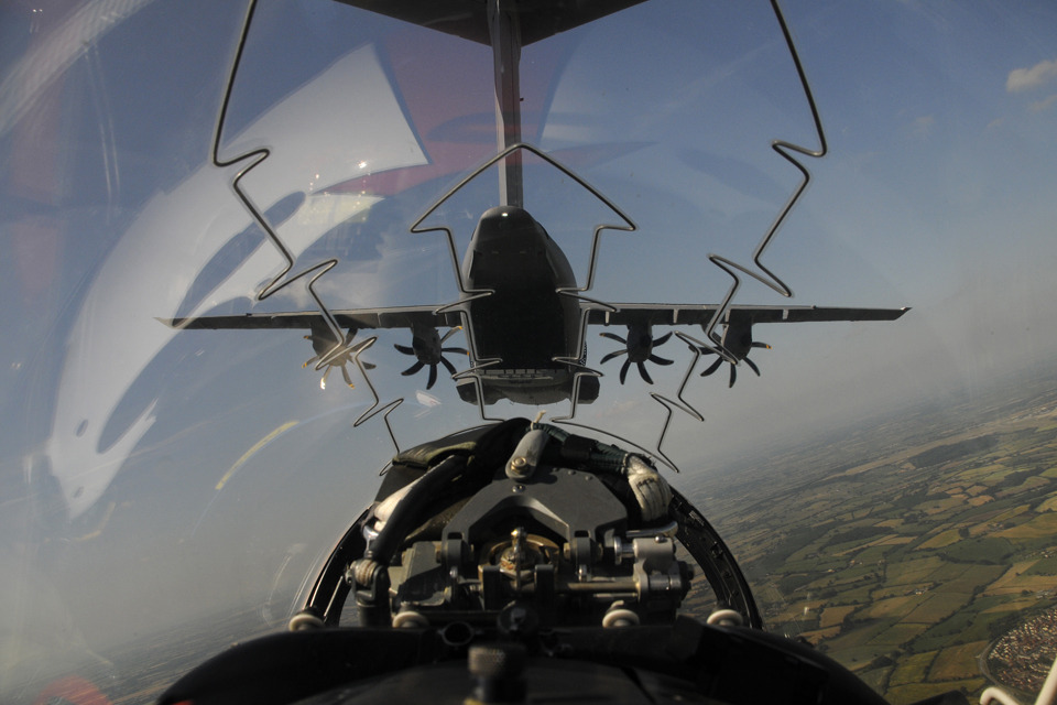 Airbus A400M Atlas in flight, taken from the backseat of a Red Arrows Hawk jet [Picture: Senior Aircraftman Craig Marshall, Crown copyright]