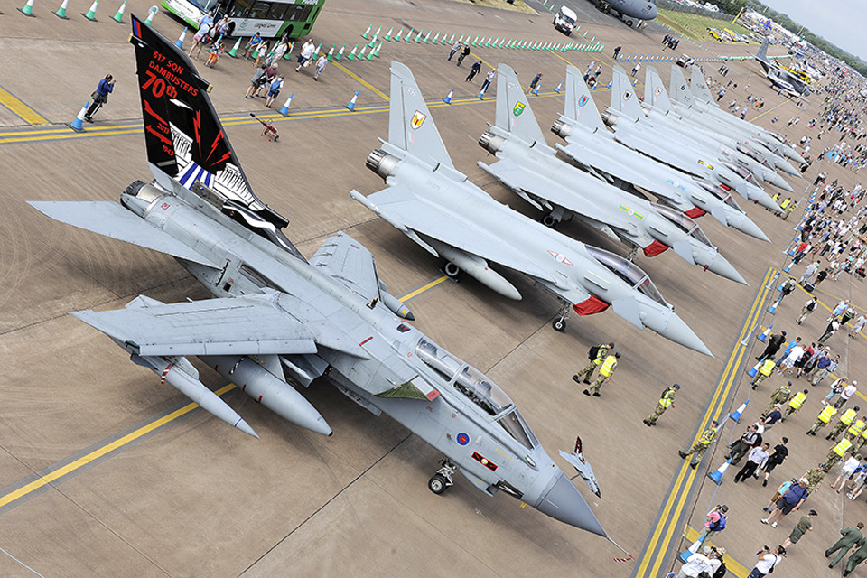 During the show, a 617 Squadron Tornado GR4 from RAF Lossiemouth, near Inverness, flew alongside a historic Avro Lancaster from the RAF Battle of Britain Memorial Flight in a salute to mark the 70th anniversary of the squadron’s legendary ‘Dambuster Raids’.
