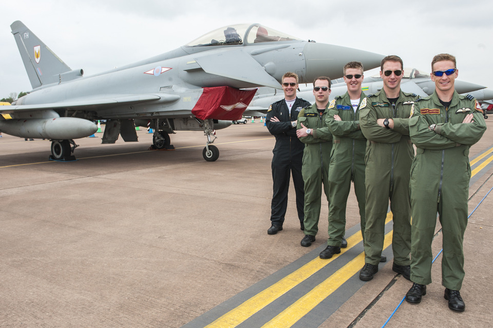 Pilots from 5 of the RAF's 6 Typhoon squadrons pose for a group shot in front of a Typhoon jet from No 1 Squadron [Picture: Senior Aircraftman Lee Matthews, Crown copyright]