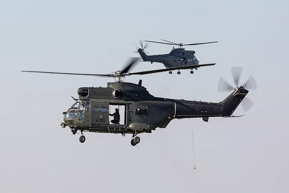 Picture shows 2 RAF Puma in the sky on route to return to their home in Oxfordshire.