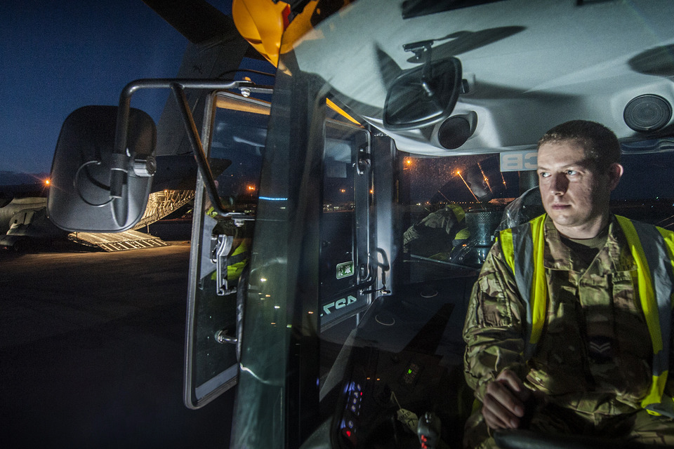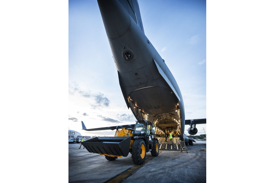 The unloading of the JCBs, two Defender Land Rovers and pallets of medical supplies was done in 1-and-a-half hours by 3 airmen from No 1 Air Mobility Wing based at RAF Brize Norton.