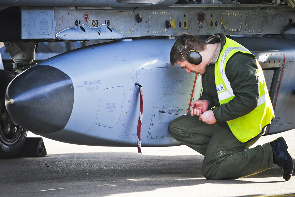 An RAF engineer prepares a Tornado's reconnaissance pod before a sortie to provide imagery of the Thames Valley area [Picture: Senior Aircraftman Andy Masson, Crown copyright]