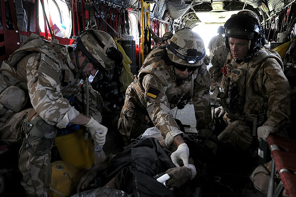 Members of a Medical Emergency Response Team treat a casualty in the back of a Chinook helicopter during transit to Camp Bastion field hospital (stock image) [Picture: Corporal Mike O'Neill, Crown Copyright/MOD 2009]