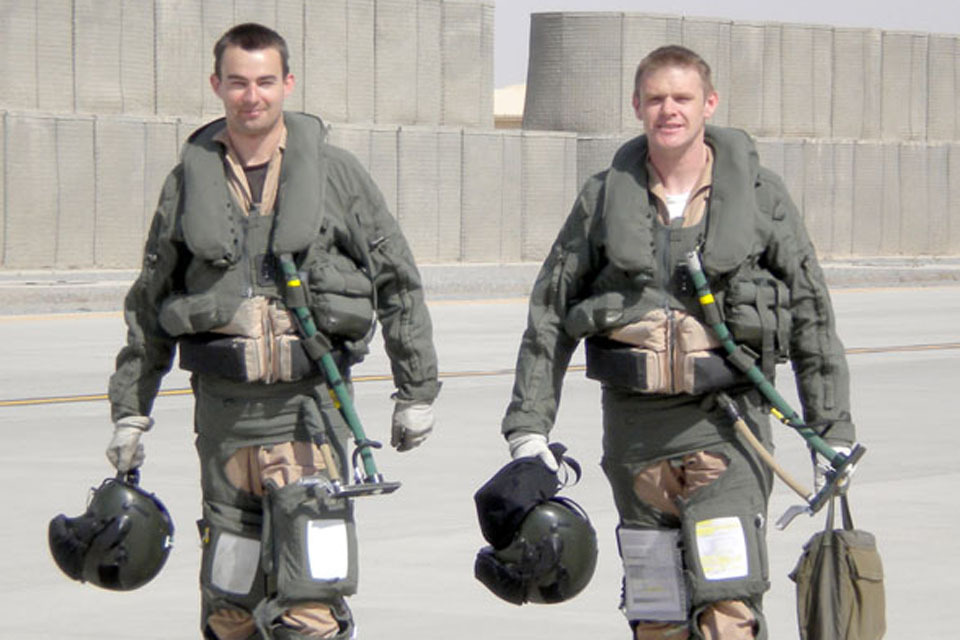 Flight Lieutenants Chris Jenkins (left), Tornado pilot, and Jamie Newton, navigator; both are serving with II (Army Cooperation) Squadron, Royal Air Force, in Kandahar, Afghanistan [Picture: Lesley Woods, Crown Copyright/MOD 2010]