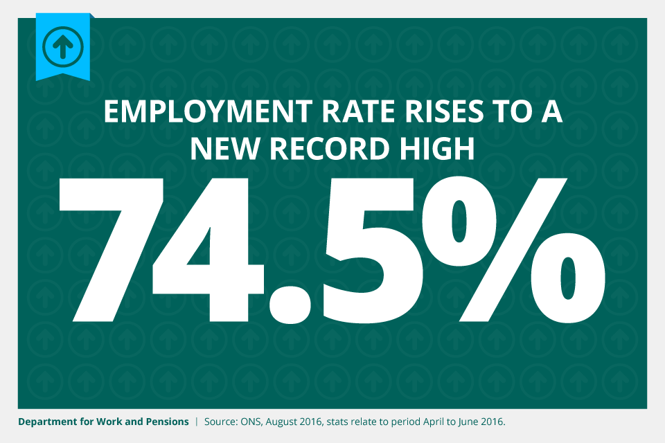 The employment rate in the UK is now at a record high of 74.5% and the unemployment rate is at its lowest level in over 10 years at 4.9%.