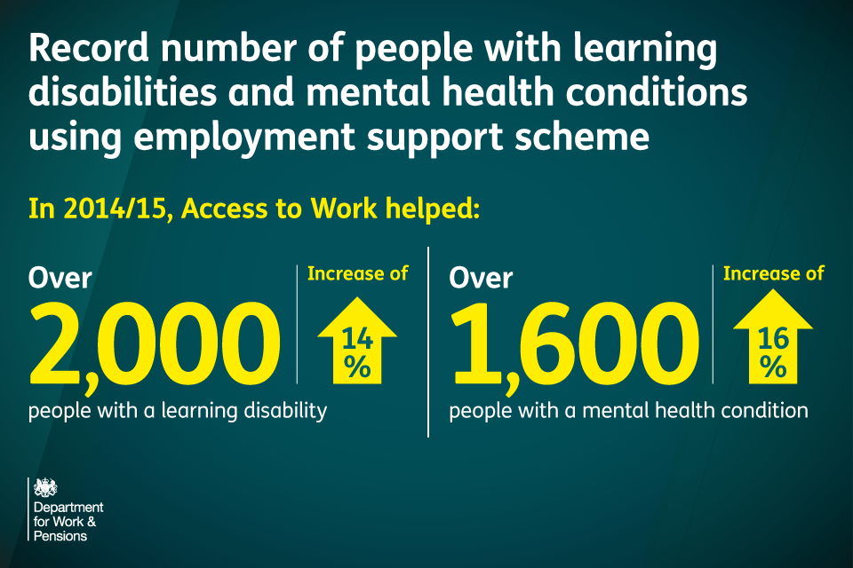 New figures show more than 2,000 people with a learning disability were helped by the initiative in the year to 31 March 2015 with more new awards than ever before. The number of people with mental health conditions using the scheme – which includes the recently-established Mental Health Support Service in Access to Work – has continued to rise and now stands at more than 1,600.