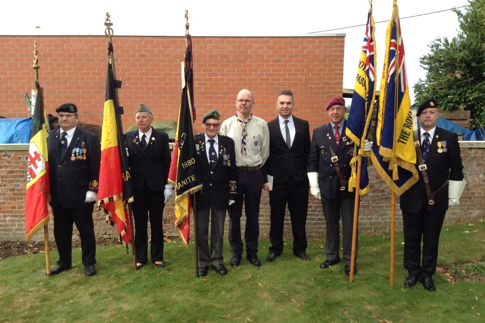 (left to right): CSM Gale’s great grandson Gary Boxall and his son Guy Boxall stand side by side the Belgium flag bearers and two representing the Royal British Legion - Crown Copyright - All rights reserved