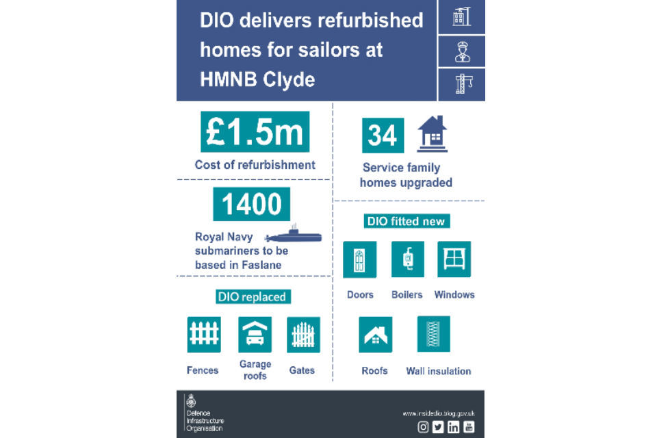 The Ministry of Defence’s (MOD) Defence Infrastructure Organisation (DIO) led the £1.5 million refurbishment at Bannachra Drive in Helensburgh, which will help improve the lives of Royal Navy families already living in the area, and of some of the hundreds of families expected to move to the vicinity when the base becomes the Submarine Centre of Specialisation.