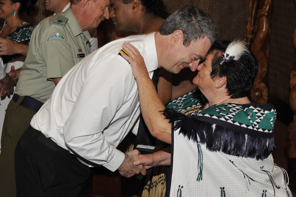 The attendees were welcomed to the base with a traditional Maori ceremony at the marae (meeting house). This involved the visitors greeting everyone, from the Maritime Component Commander, Commodore John Martin RNZN, to the naval rates, with the traditional touching of nose and forehead, the hongi.
