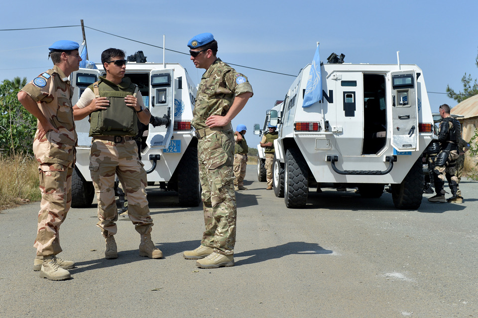 Major Paul Walkley (right), Officer Commanding the Mobile Force Reserve in Cyprus, speaks with UN colleagues [Picture: Corporal Steve Blake, Crown copyright]