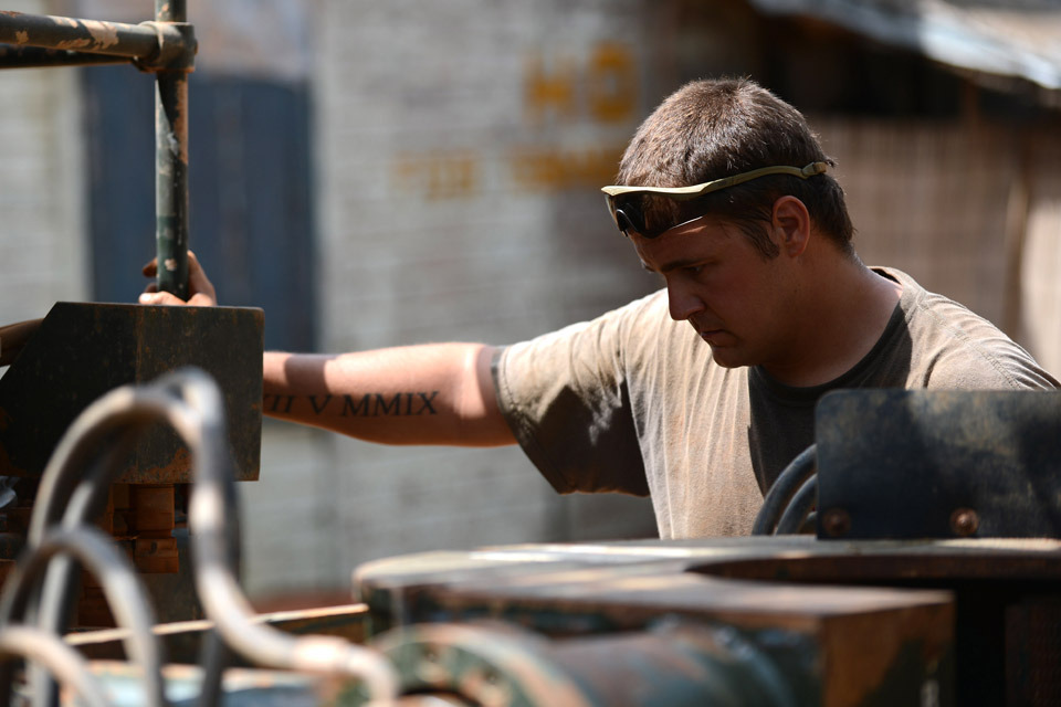 Lance Corporal Patrick Crowe examines a drill rig [Picture: Corporal Andy Reddy, Crown copyright]