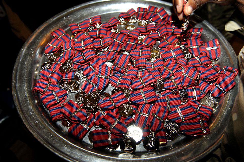 A plate of special medals awarded to the children of 64 Works Group Royal Engineers for their good behaviour during the soldiers' deployment [Picture: Richard Watt, Crown Copyright/MOD 2012]
