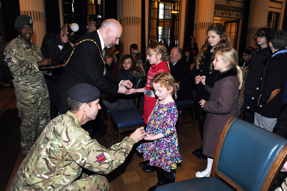 Children receive specially-commissioned medals in Royal Engineers colours from Lieutenant Colonel Tony Tait and Councillor Leon Unczur [Picture: Richard Watt, Crown Copyright/MOD 2012]