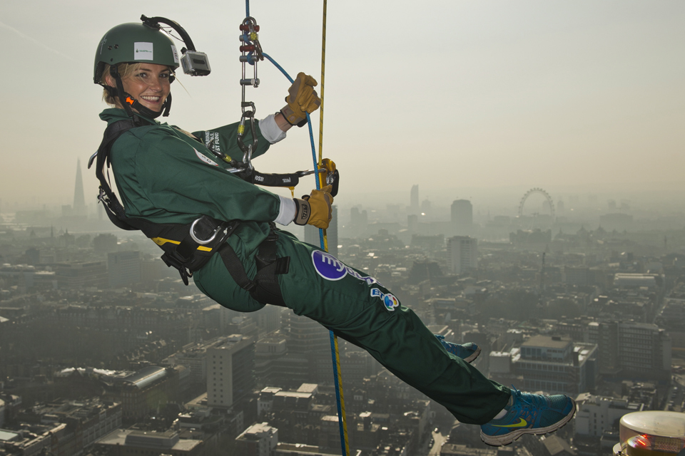 TV presenter Helen Skelton begins her abseil down the BT Tower [Picture: Shaun Smith, Crown copyright]