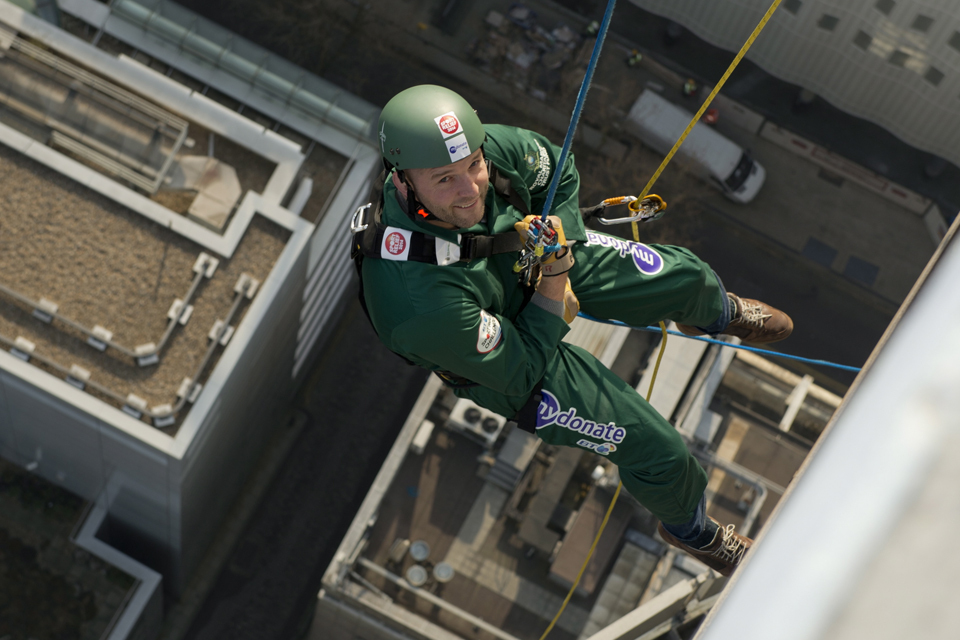 Former Lion and England rugby world cup winner Ben Kay begins his abseil down the BT Tower [Picture: Shaun Smith, Crown copyright]