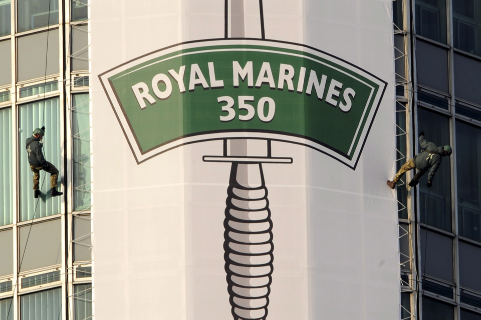 Two Royal Marines launched both the Royal Marines’ 350th anniversary celebrations and a charity fundraising campaign by abseiling down the iconic BT Tower in London this morning.