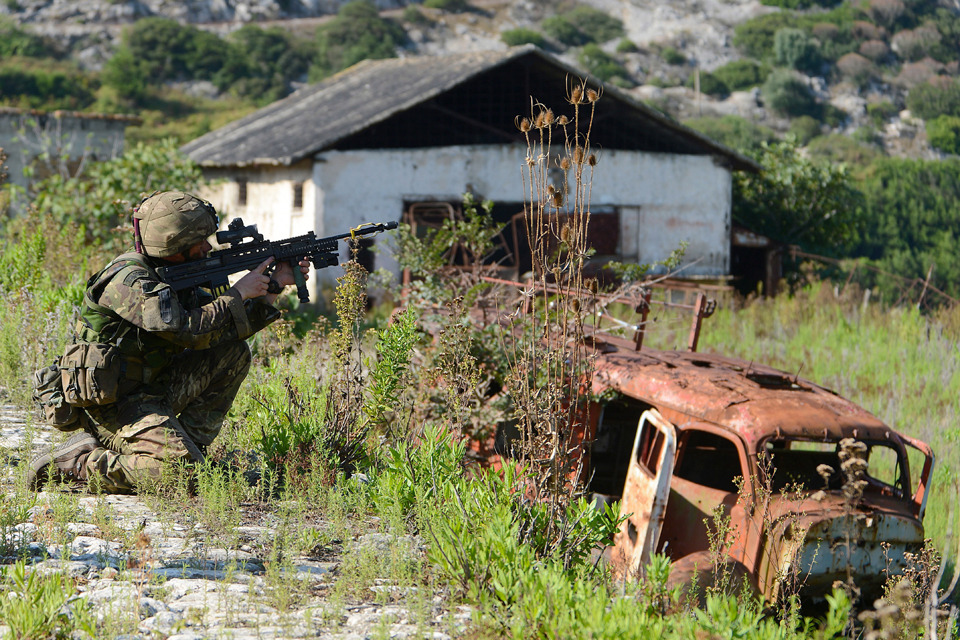 A Royal Marine keeps a watchful eye out for the enemy during the assault on Sazan Island [Picture: Petty Officer (Photographer) Sean Clee, Crown copyright]