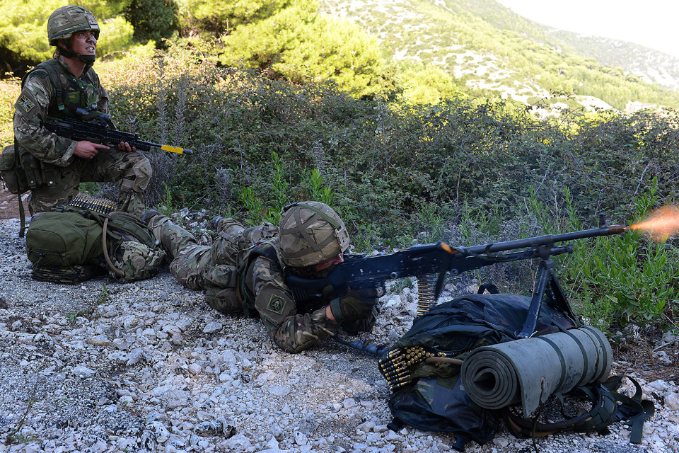 A Royal Marine opens up on an enemy position with a general purpose machine gun during the assault on Sazan Island [Picture: Petty Officer (Photographer) Sean Clee, Crown copyright]